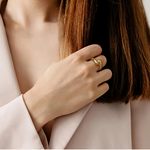Ringen CORA - Opplev et moderne og skulpturelt design som elegant omfavner fingeren din med organiske former. Denne dristige ringen med to glatte, bølgede overflater er et iøynefallende og luksuriøst tilbehør til enhver smykkesamling.