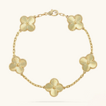 Klover-kolleksjonens armbånd er et tidløst smykke med et delikat design, prydet med tre symboler, som gir et subtilt, men elegant preg til håndleddet ditt. Laget av høykvalitets rustfritt stål belagt med 18-karat gull, er disse armbåndene både nikkelfrie og hypoallergene, noe som sikrer komfort hele dagen.