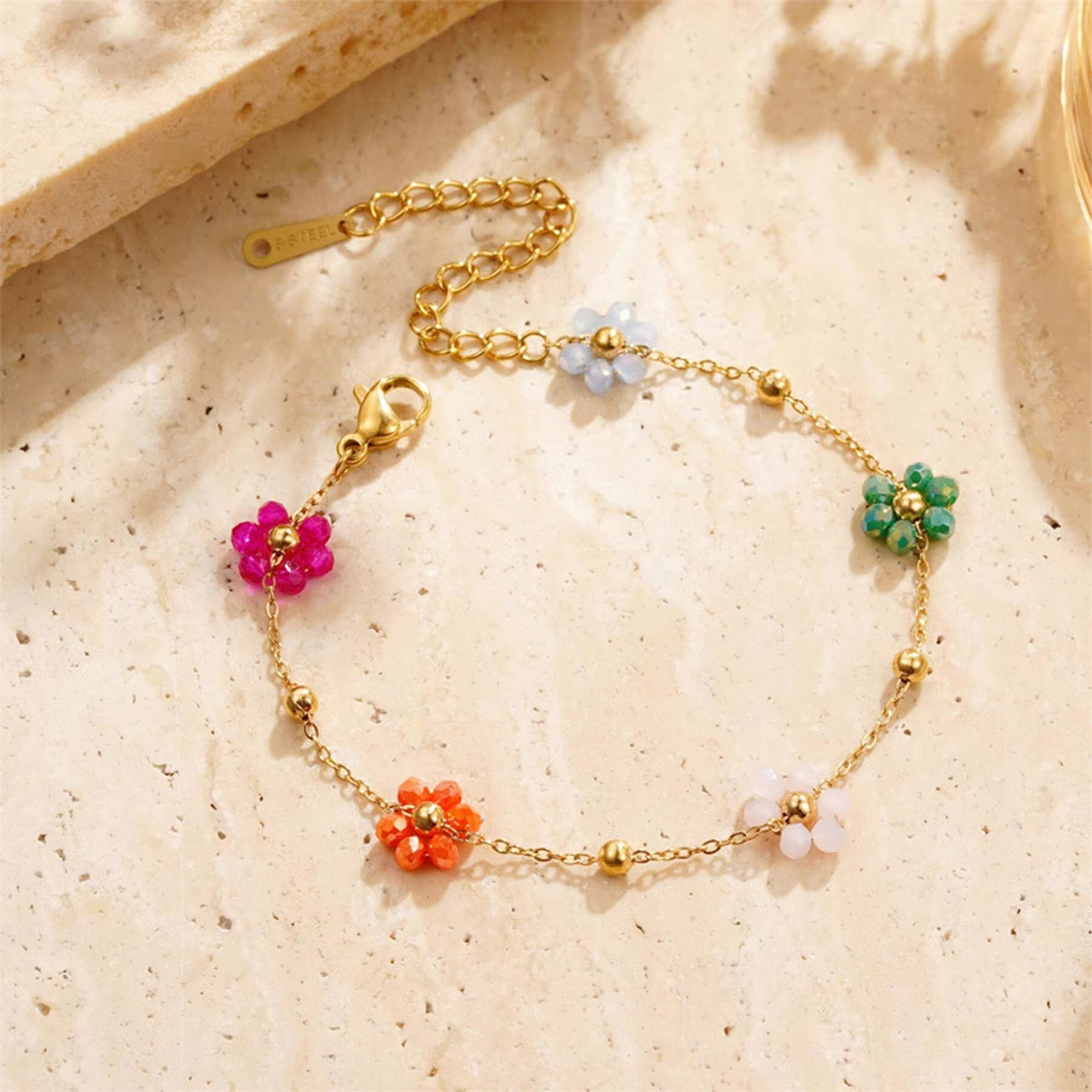 Oppdag AVARIA’s Azalea armbånd – en perfekt kombinasjon av farge og sjarm som omfavner håndleddet ditt. Dette unike armbåndet har delikate glassblomster lenket sammen på et gyllent kjede, og gir et gledelig preg til enhver stabel.