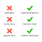 WATERPROOF, HYPOALLERGENIC, AND TARNISH RESISTANT.