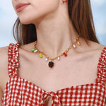 Oppdag AVARIAs Michelle-halskjede – en sprudlende fruktig morsomhet! Denne gullkjeden er prydet med et lekent utvalg av fargerike fruktcharms og delikate perler, perfekt for å tilføre et snev av fantasi til ethvert antrekk.