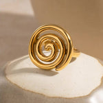 Oppdag ditt sentrum med AVARIAs Christy-ring. Den unike virvlende gulldesignen tiltrekker blikket og gir en følelse av fokus og kunstnerisk uttrykk.